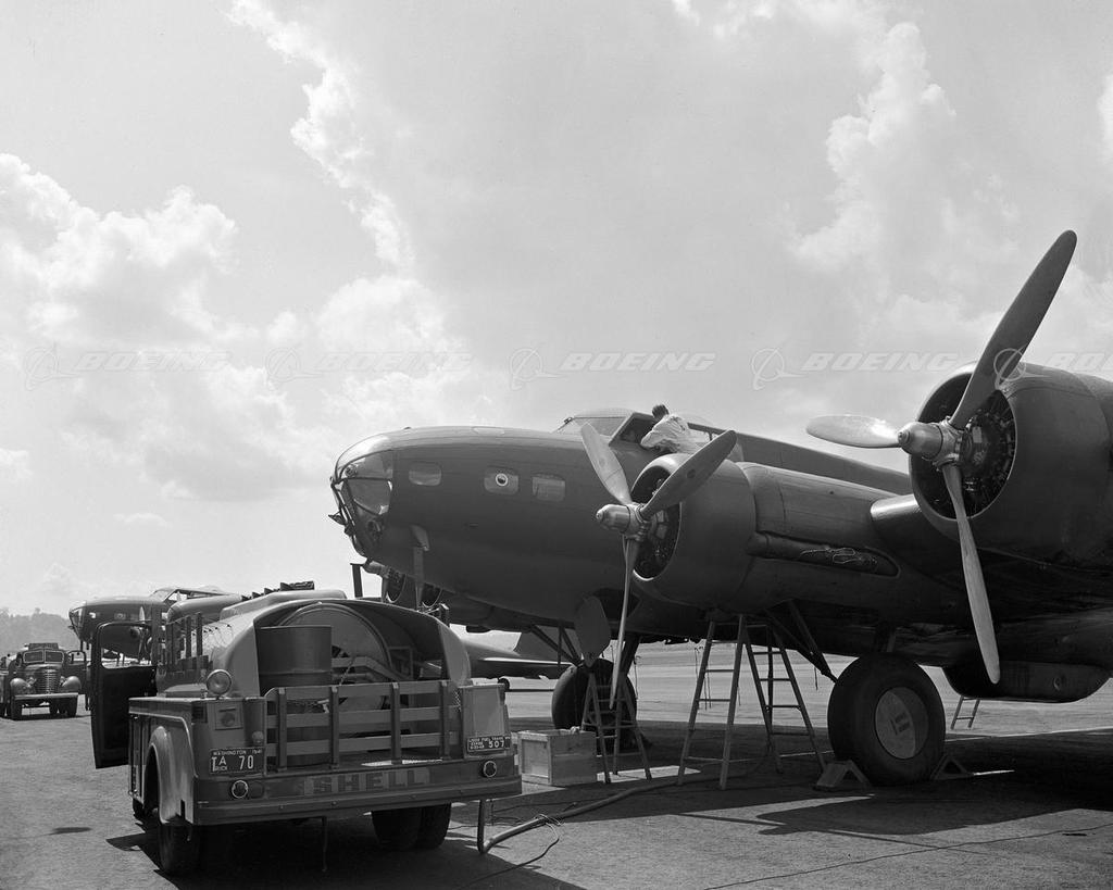 The Boeing B-17C of 1940. On this model of the Flying Fortress, side blisters were replaced by flat paneled gun positions, a gun position was installed under the fuselage, and greater armor plate was added. The first of 20 of this order were assigned to Britain's Royal Air Force, and Germany got her first taste of effectiveness of this substratoshpere bomber when an RAF squadron scored hits on the battleships Scharnhorst and Gneisnau in the harbor of at Brest from altitudes never before used in bombing. A total of 38 B-17Cs was built, while Stratoliner production also continued. B-17C Specifications: Wing span, 103' 9"; length, 67' 10"; weight, 39,065 lbs; speed, 300 mph; ceiling, 36,000 ft; range, 3,400 miles; power, four Wright R-1820 (1,000 hp) engines.