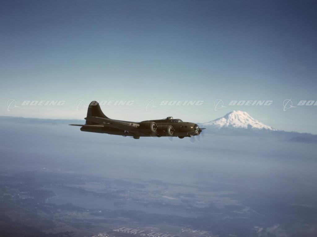 B-17E Flying Fortress Flies Past Mt. Rainier, Air to Air