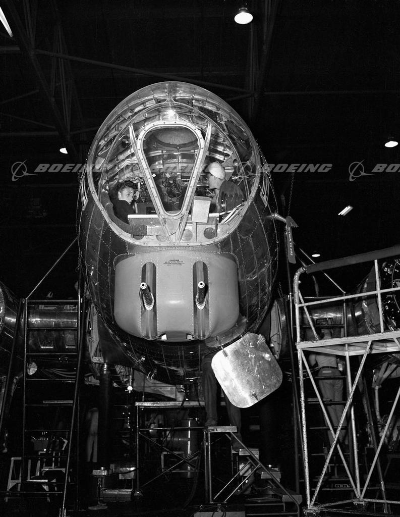 In response for the Army’s request for a large, multiengine bomber, the B-17 (Model 299) prototype, financed entirely by Boeing, went from design to flight test in less than 12 months. The B-17 Flying Fortress was a low-wing monoplane that combined aerodynamic features of the XB-15 giant bomber, and the Model 247 transport. The B-17 was the first Boeing military aircraft with a flight deck instead of an open cockpit and was armed with bombs and five .30-caliber machine guns mounted in clear blisters. Each version of the B-17 was more heavily armed. Described by General H. H. Hap Arnold, as the backbone of our worldwide aerial offensive, the B-17 Flying Fortress served in every World War II combat zone. Boeing, Douglas, and Lockheed Vega produced 12,731 B-17s, and the four-engine bombers became legendary for their ability to stay in the air after taking brutal poundings.