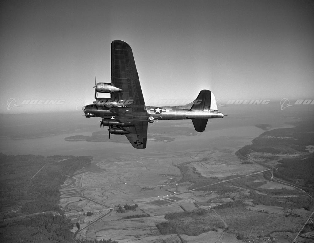 In response for the Army’s request for a large, multiengine bomber, the B-17 (Model 299) prototype, financed entirely by Boeing, went from design to flight test in less than 12 months. The B-17 Flying Fortress was a low-wing monoplane that combined aerodynamic features of the XB-15 giant bomber, and the Model 247 transport. The B-17 was the first Boeing military aircraft with a flight deck instead of an open cockpit and was armed with bombs and five .30-caliber machine guns mounted in clear blisters. Each version of the B-17 was more heavily armed. Described by General H. H. Hap Arnold, as the backbone of our worldwide aerial offensive, the B-17 Flying Fortress served in every World War II combat zone. Boeing, Douglas, and Lockheed Vega produced 12,731 B-17s, and the four-engine bombers became legendary for their ability to stay in the air after taking brutal poundings.