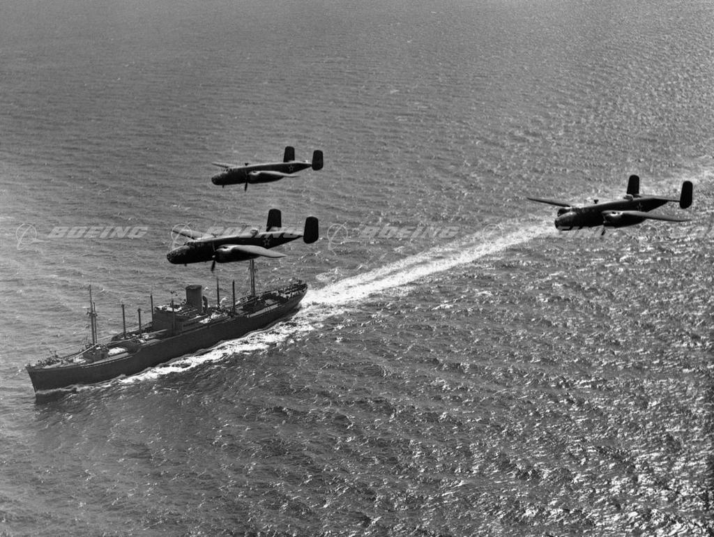Named after General 'Billy' Mitchell, America's foremost supporter of air power, the B-25 Mitchell first flew on Aug. 19, 1940, and was the first multiengine design to go beyond the prototype stage. North American Aviation built more than 11,000 B-25s for the U.S. Army Air Forces and the U.S. Navy, which called it the PBJ, plus 50 each for China and Great Britain. The B-25 bomber had a wingspan of 67 feet and was 52 feet 11 inches long. One version, the B-25H, was the most heavily armed attack bomber of its time, with a 75-millimeter gun, up to 14 .50 caliber machine guns and 5,000 pounds of bombs carried in an internal bomb bay.