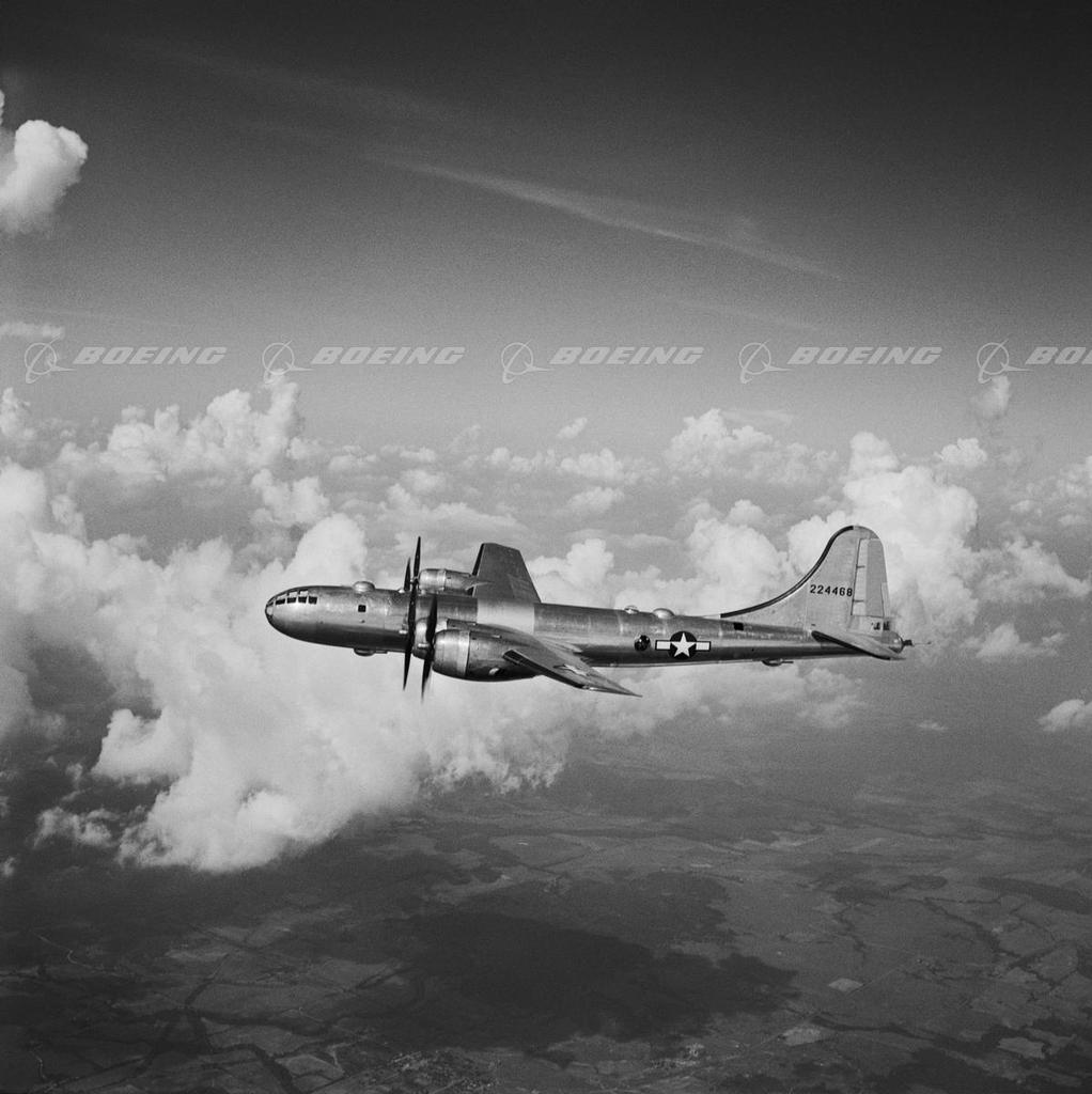 The Boeing B-29, the most technologically advanced airplane produced during World War II, first flew Sept. 21, 1942. At 105,000 pounds, it was the world's heaviest production airplane. It was the first bomber with crew-cabin pressurization and remotely controlled power turrets. A total of 3,970 B-29s were built, with improvements added to the bombers as they went through the production line as data came in from pilots in action. World War II ended when two B-29s, the Enola Gay and Bockscar dropped atomic bombs on Hiroshima and Nagasaki.