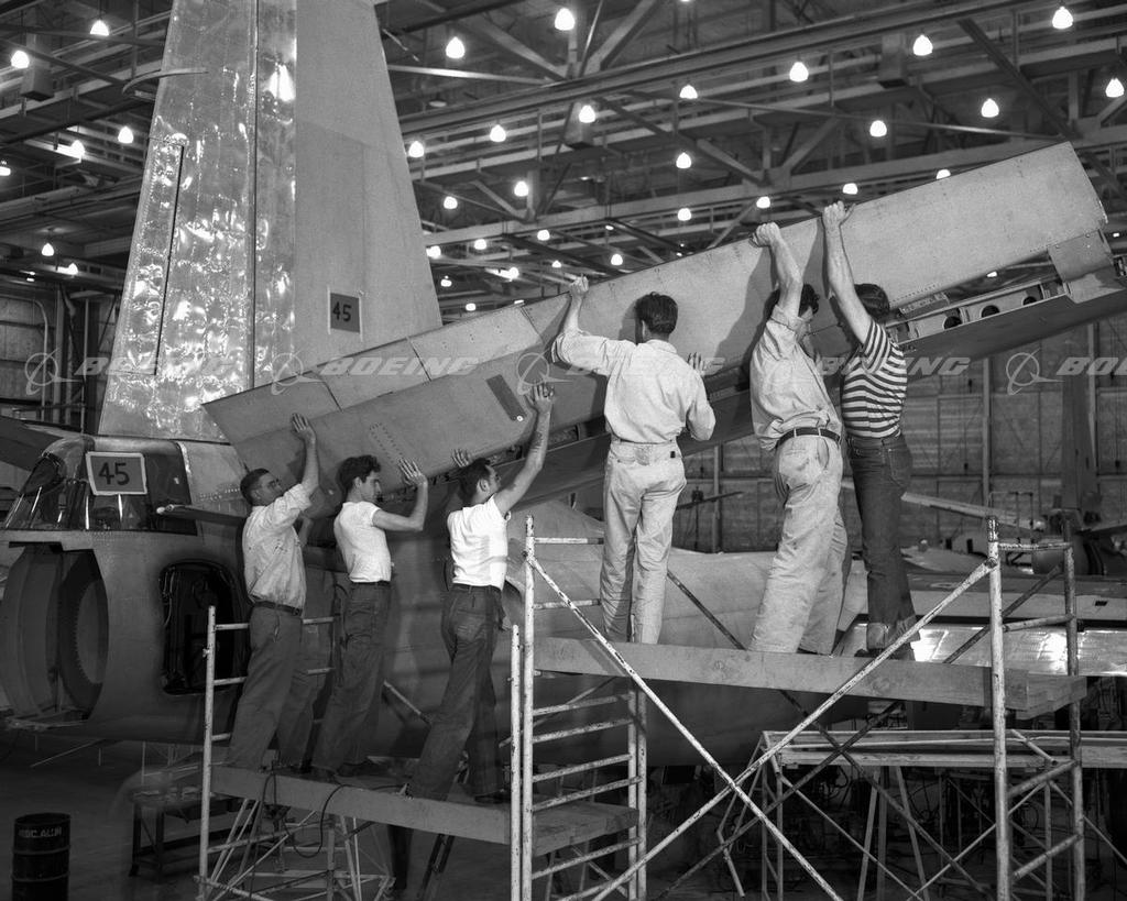 North American Aviation's straight-wing B-45 Tornado, designed during 1944 and 1945, first flew in February 1947. It was the first jet bomber in service with the Air Force and the first four-jet airplane to fly in the United States. Versions included the longer-range B-45C with wingtip tanks and the photoreconnaissance version, the RB-45C. Rated as a light bomber by modern-day standards, it was the first four-jet aircraft to drop an atom bomb and the first to be refueled in midair. It had a wingspan of 89 feet, and it was 75 feet 11 inches long.