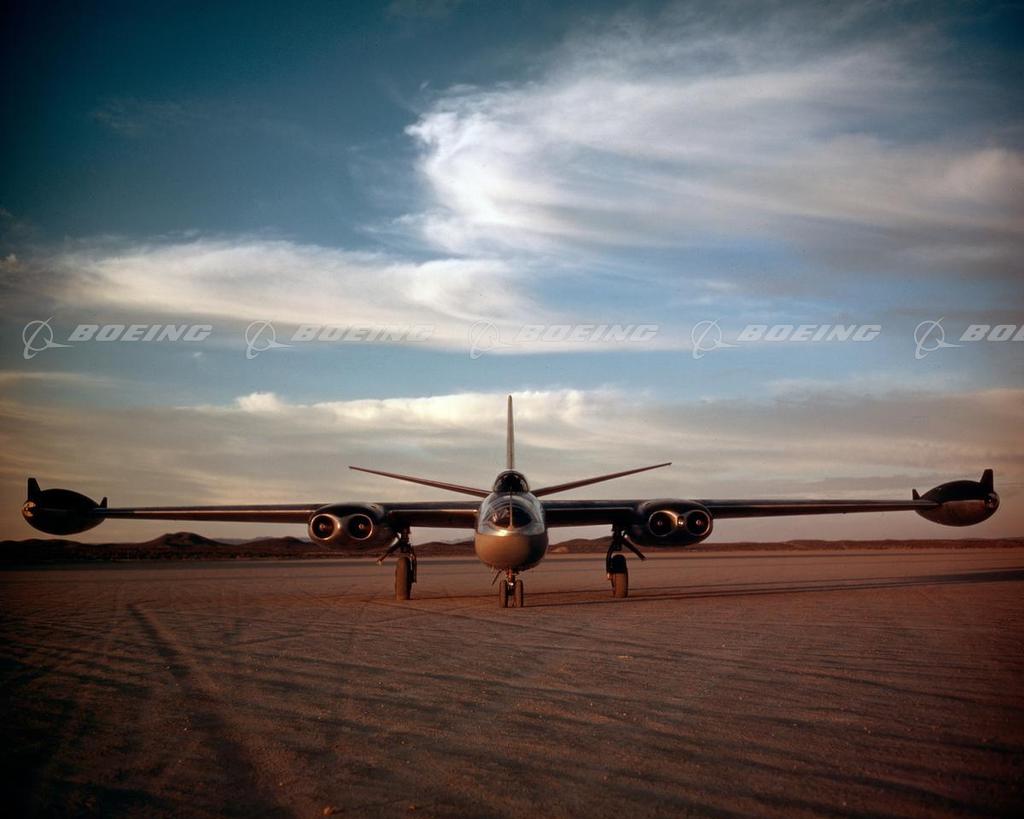 North American Aviation's straight-wing B-45 Tornado, designed during 1944 and 1945, first flew in February 1947. It was the first jet bomber in service with the Air Force and the first four-jet airplane to fly in the United States. Versions included the longer-range B-45C with wingtip tanks and the photoreconnaissance version, the RB-45C. Rated as a light bomber by modern-day standards, it was the first four-jet aircraft to drop an atom bomb and the first to be refueled in midair. It had a wingspan of 89 feet, and it was 75 feet 11 inches long.