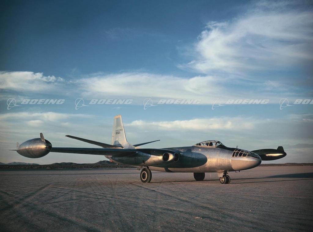 North American Aviation’s straight-wing B-45 Tornado, designed during 1944 and 1945, first flew in February 1947. It was the first jet bomber in service with the Air Force and the first four-jet airplane to fly in the United States. Versions included the longer-range B-45C with wingtip tanks and the photoreconnaissance version, the RB-45C. Rated as a light bomber by modern-day standards, it was the first four-jet aircraft to drop an atom bomb and the first to be refueled in midair. It had a wingspan of 89 feet, and it was 75 feet 11 inches long.