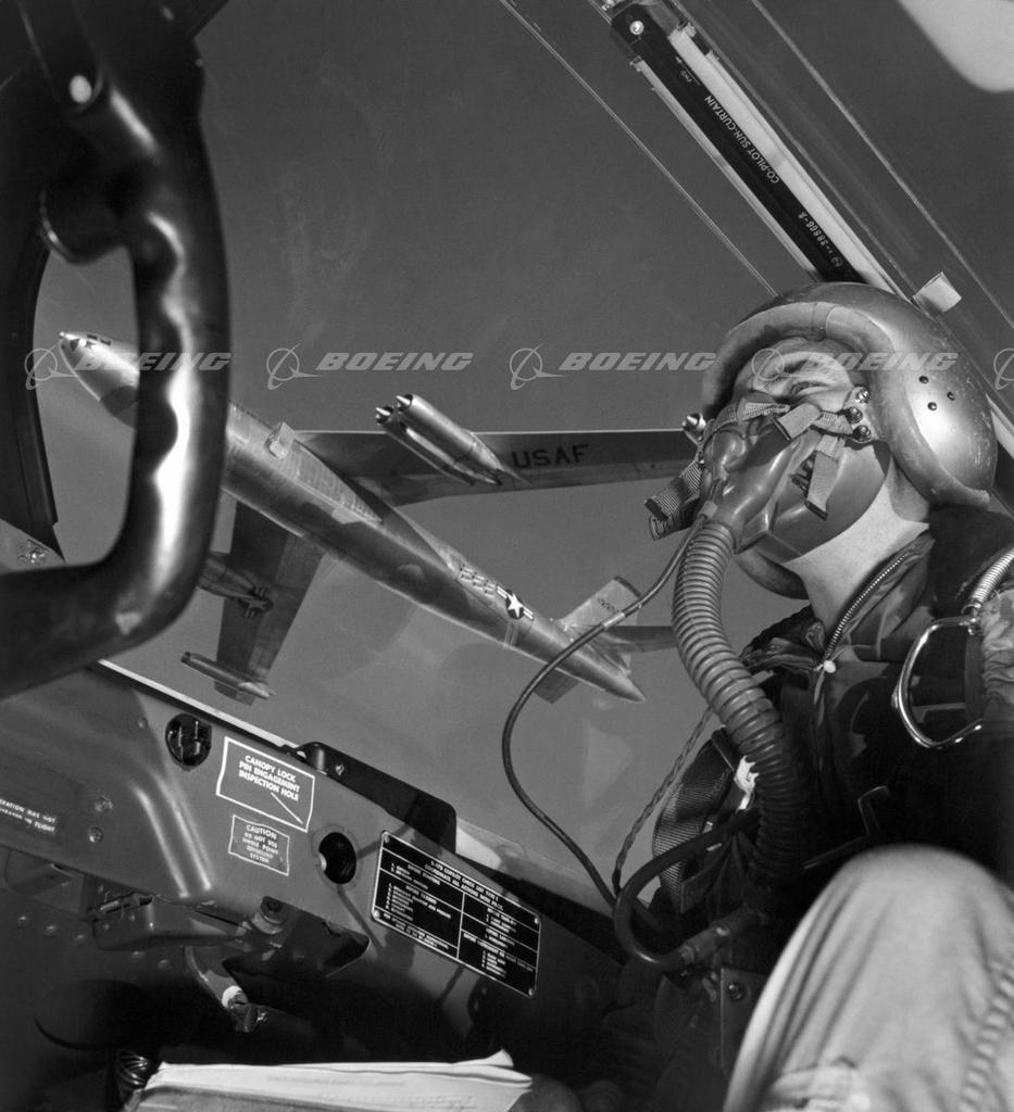At the time of its first flight, Dec. 17, 1947, the B-47 Stratojet represented a radical departure from traditional design, and it set the design standards for all large jet aircraft until the present time. The six-engine Boeing B-47 was America's first multiengine swept-wing jet bomber. Its thin 116-foot wing was extraordinarily flexible and swept back at a 35-degree angle. Eighteen small rocket units in the fuselage provided jet-assisted takeoff (JATO), and parachutes cut its landing speeds. Later models were powered by 5,200-pound-thrust axial-flow jet engines, and top speeds were 600 mph. A total of 2,032 B-47s in all versions were built.