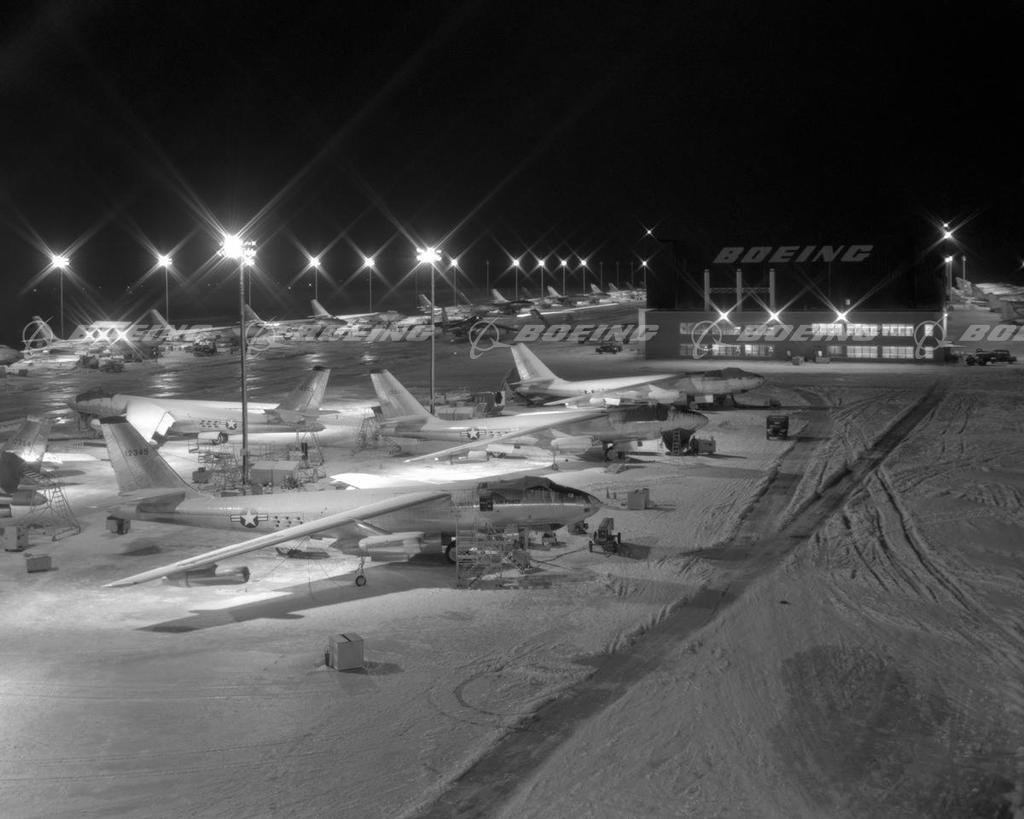 At the time of its first flight, Dec. 17, 1947, the B-47 Stratojet represented a radical departure from traditional design, and it set the design standards for all large jet aircraft until the present time. The six-engine Boeing B-47 was America's first multiengine swept-wing jet bomber. Its thin 116-foot wing was extraordinarily flexible and swept back at a 35-degree angle. Eighteen small rocket units in the fuselage provided jet-assisted takeoff (JATO), and parachutes cut its landing speeds. Later models were powered by 5,200-pound-thrust axial-flow jet engines, and top speeds were 600 mph. A total of 2,032 B-47s in all versions were built.