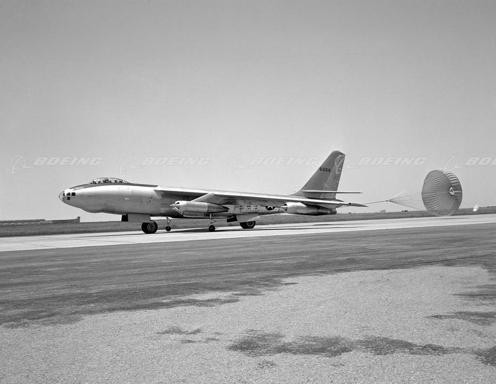 At the time of its first flight, Dec. 17, 1947, the B-47 Stratojet represented a radical departure from traditional design, and it set the design standards for all large jet aircraft until the present time. The six-engine Boeing B-47 was America's first multiengine swept-wing jet bomber. Its thin 116-foot wing was extraordinarily flexible and swept back at a 35-degree angle. Eighteen small rocket units in the fuselage provided jet-assisted takeoff (JATO), and parachutes cut its landing speeds. Later models were powered by 5,200-pound-thrust axial-flow jet engines, and top speeds were 600 mph. A total of 2,032 B-47s in all versions were built.