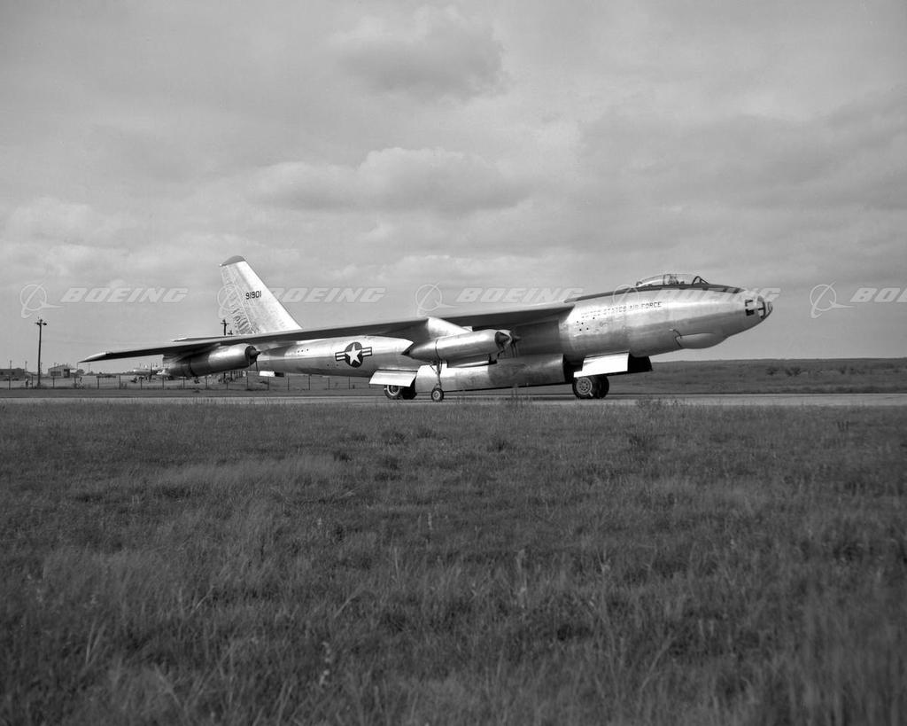 At the time of its first flight, Dec. 17, 1947, the B-47 Stratojet represented a radical departure from traditional design, and it set the design standards for all large jet aircraft until the present time. The six-engine Boeing B-47 was America's first multiengine swept-wing jet bomber. Its thin 116-foot wing was extraordinarily flexible and swept back at a 35-degree angle. Eighteen small rocket units in the fuselage provided jet-assisted takeoff (JATO), and parachutes cut its landing speeds. Later models were powered by 5,200-pound-thrust axial-flow jet engines, and top speeds were 600 mph. A total of 2,032 B-47s in all versions were built.