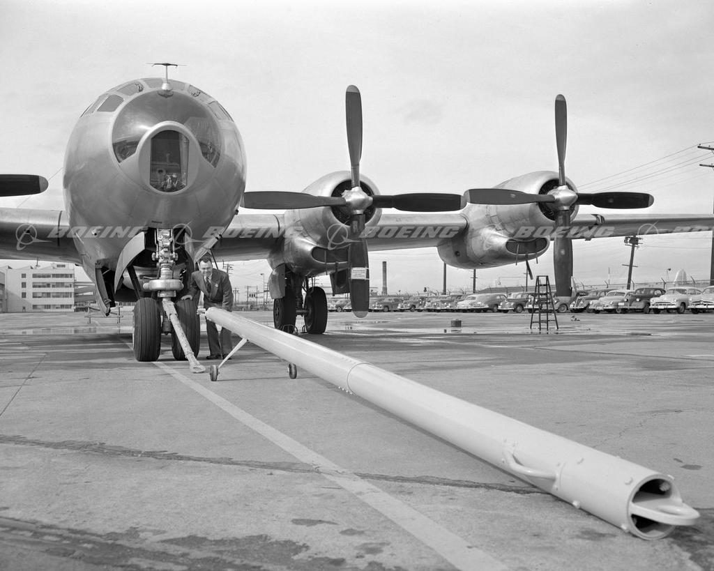 The four-engine, propeller-powered B-50 bomber, which first flew in 1947, was among the last piston-powered bombers built during an era that was to be dominated by jets. However, in 1949, the B-50A, the Lucky Lady II, made the first nonstop flight around the world in 94 hours, refueled in flight four times by KB-29Ms. The B-50 originally evolved from the B-29D but because it included so many improvements, it was redesignated the B-50A, with 59 percent more power than the B-29. The next version, the B-50B, fitted with cameras and wing tanks, was designated RB-50B and used for strategic reconnaissance. The B-50D, the most common variant, was distinguished by a one-piece transparent-plastic nose molding and an optically flat bombardier’s window in the lower portion. Some B50s were later converted to hose-type KB-50 aerial tankers, their speed enhanced by the addition of two 5,200-pound-thrust jet engines, so at 400 mph, they could refuel jet aircraft. One KB-50D became a drone to test Bell XGAM missiles and 36 became long-range reconnaissance aircraft (WB-50D).