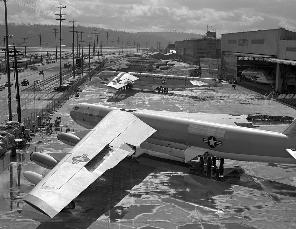 B-52D on Boeing Flight Line with KC-135 and 707s, 1959