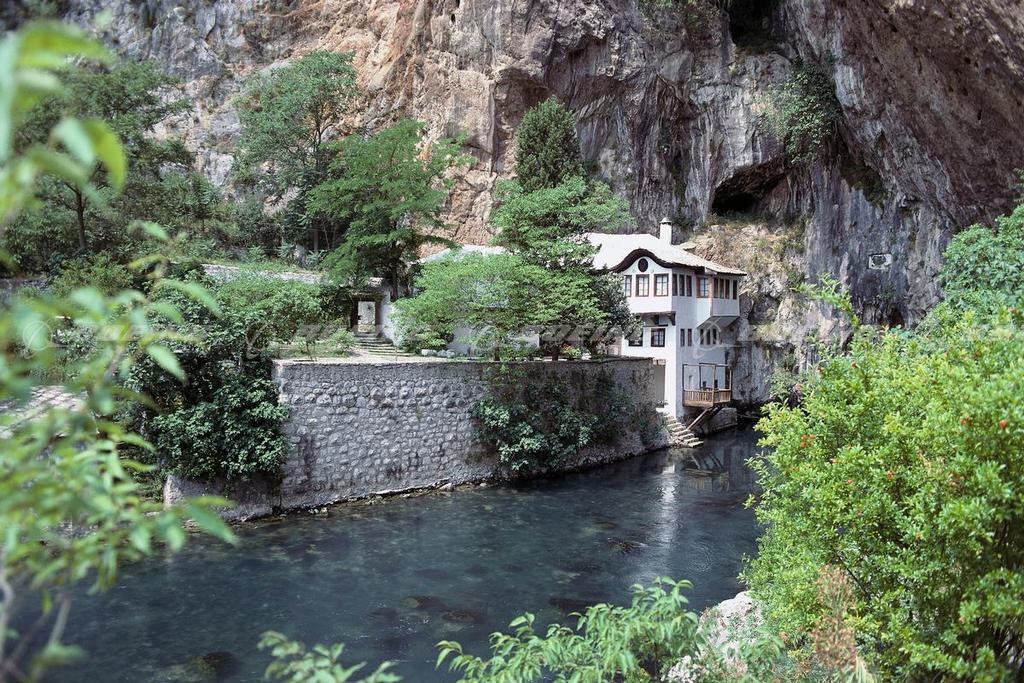 Water flowing from an underground karst river is the source of the Buna River. The river flows out of a 200 meter cliff and joins the Neretva River downstream.
