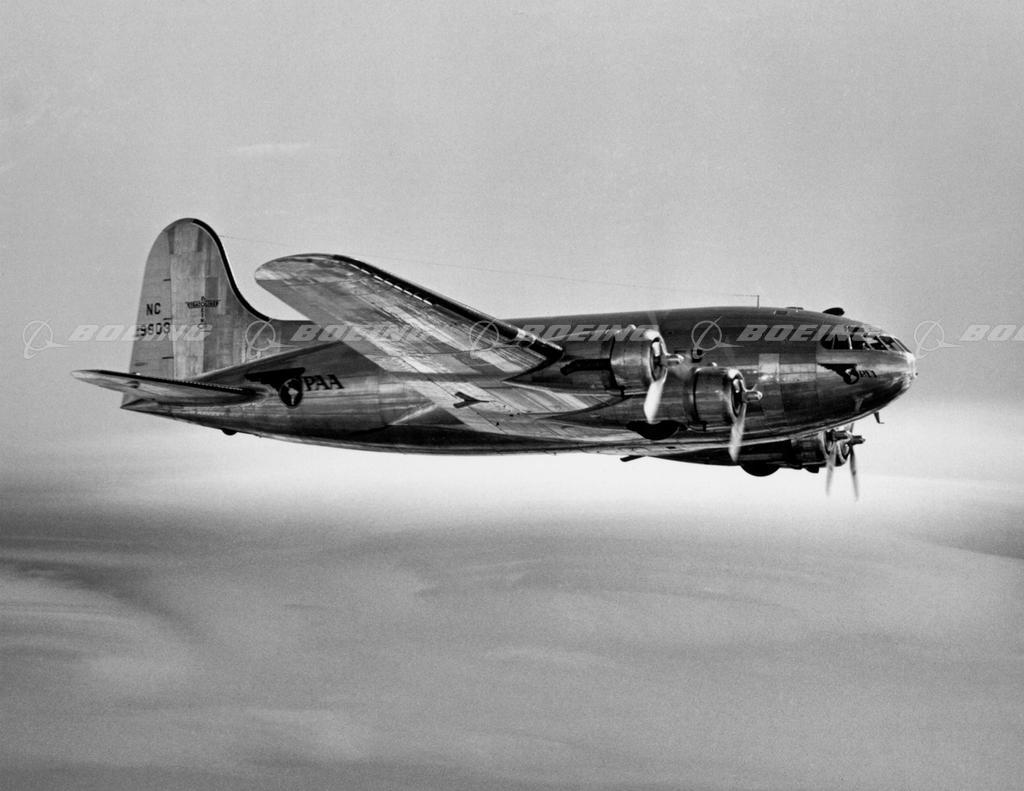 The Boeing Model 307 pressurized cabin allowed the airplane to soar (220 mph cruising speed) above rough weather at an altitude of 20,000 feet -- higher than any other transport of its time. With names like Rainbow, Comet, Flying Cloud and Apache, the Stratoliner set new standards for speed and comfort. The Stratoliner was the first airplane with hydraulically boosted control surfaces (elevators and rudder) and the first airliner with geared two speed engine superchargers. Boeing built 10 Model 307s.