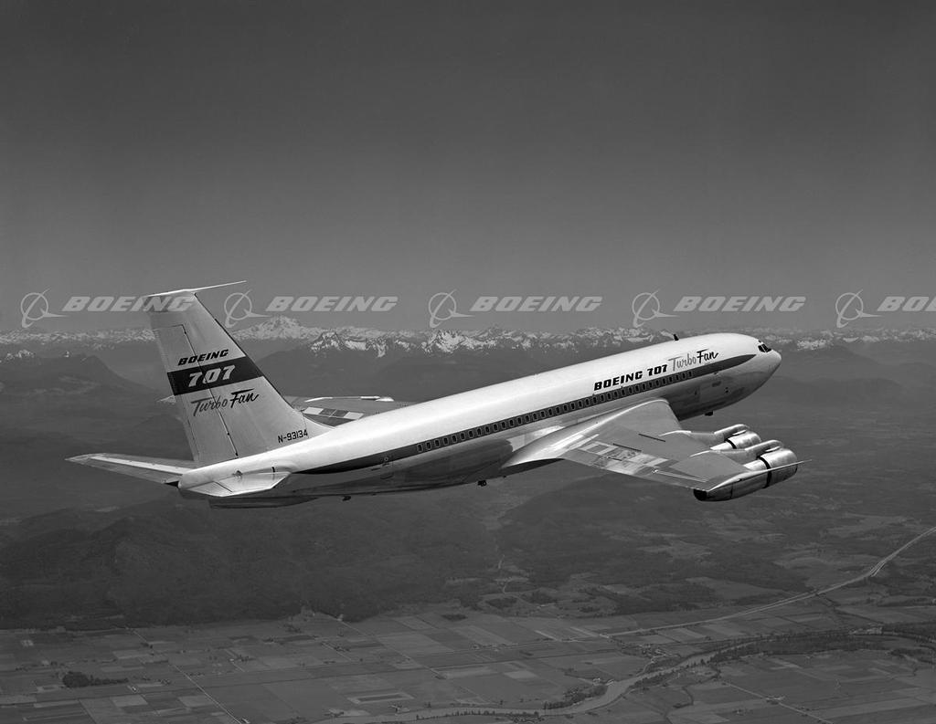After the Air Force agreed to let Boeing build commercial jets based on the prototype, 367-80, already the basis for the KC-135 military tanker, airlines began to order the 707, the commercial transport variant of the Dash 80. The 707 and the KC-135 had many features in common. Both were visually distinct, with a stinger antenna pointing forward from the top of their vertical fin. The 707's width and 100-foot length made it the largest passenger cabin in the air at the time. Placement of its more than 100 windows allowed airlines to rearrange seats. Location of passenger doors on the left side, at the front and at the rear of the cabin, became standard for subsequent Boeing jets. The exteriors of the 707 and its competitor, the DC-8, were almost identical, but the 707 wing had more sweepback, so it could fly about 20 mph faster.