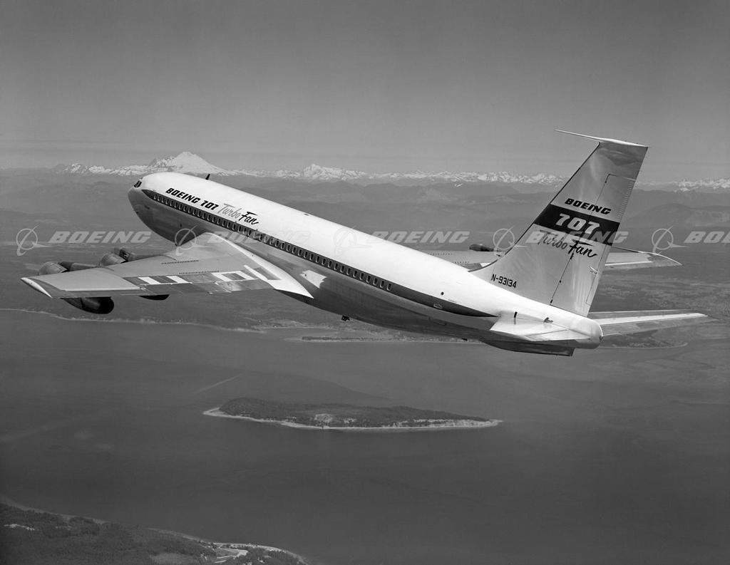 After the Air Force agreed to let Boeing build commercial jets based on the prototype, 367-80, already the basis for the KC-135 military tanker, airlines began to order the 707, the commercial transport variant of the Dash 80. The 707 and the KC-135 had many features in common. Both were visually distinct, with a stinger antenna pointing forward from the top of their vertical fin. The 707's width and 100-foot length made it the largest passenger cabin in the air at the time. Placement of its more than 100 windows allowed airlines to rearrange seats. Location of passenger doors on the left side, at the front and at the rear of the cabin, became standard for subsequent Boeing jets. The exteriors of the 707 and its competitor, the DC-8, were almost identical, but the 707 wing had more sweepback, so it could fly about 20 mph faster.