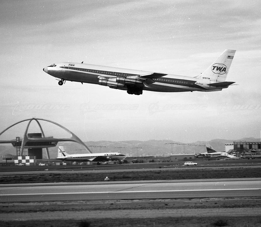 Boeing 707 airliner departs Los Angeles International Airport (LAX) circa 1961.