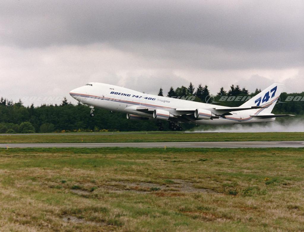Boeing 747-400 freighter taking off. First freighter rolls out of Everett, Wash. factory in 1993