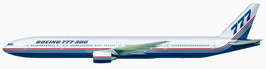 The Boeing 777-300 offers all the features of passenger comfort found in the 777-200 - including cabin spaciousness and flexibility. At 242 feet, four inches (73.9 m), the 777-300 is 33 feet (10 m) longer than the original 777-200 model. The added length increases the airplane's passenger capacity by 20 percent. The aircraft can carry 394 passengers in a typical three-class configuration, 479 passengers in a typical two-class configuration, or as many as 550 passengers in an all-economy layout.