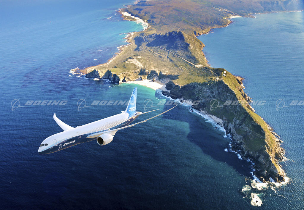 787-9 Dreamliner; 2018 BCA Unified Family livery; computer-generated imagery (CGI); air to air; viewed from above; islands; oceans; full body views; right front views; day