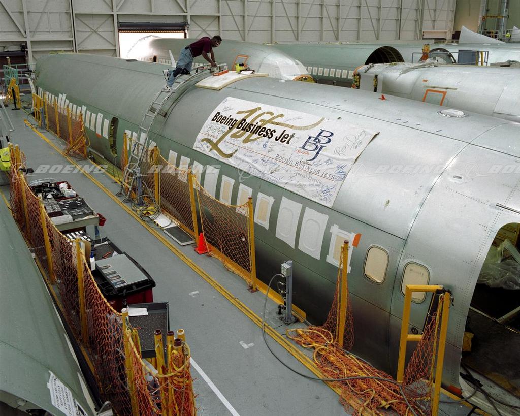 A Boeing employee works on the first Boeing Business Jet as it makes its way through the Boeing factory in Renton, Wash. The BBJ is a derivative of the Next-Generation 737, combining the 737-700 fuselage with the strengthened wings and landing gear of the larger and heavier 737-800. This combination gives the BBJ a range of 7,140 statute miles (6,200 nautical miles, 11,480 kilometers) and nearly three times the internal volume of the newest long-range corporate jets.