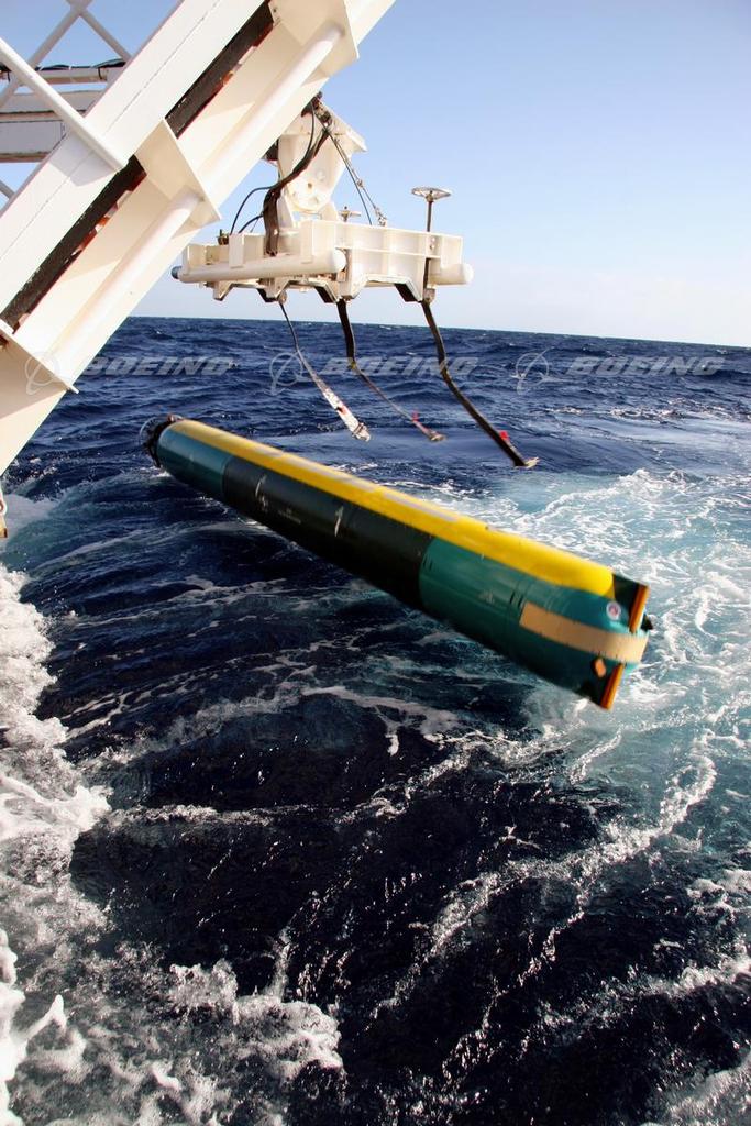 Boeing's Long-term Mine Reconnaissance System (LMRS) is dropped into the Atlantic Ocean from a telescoping torpedo launcher aboard the SV Ranger to begin its underwater surveillance test mission. LMRS uses two sonar systems, an advanced computer and its own inertial navigation system to survey the ocean floor for up to 60 hours. The system is designed to withstand both torpedo-style and surface launches.