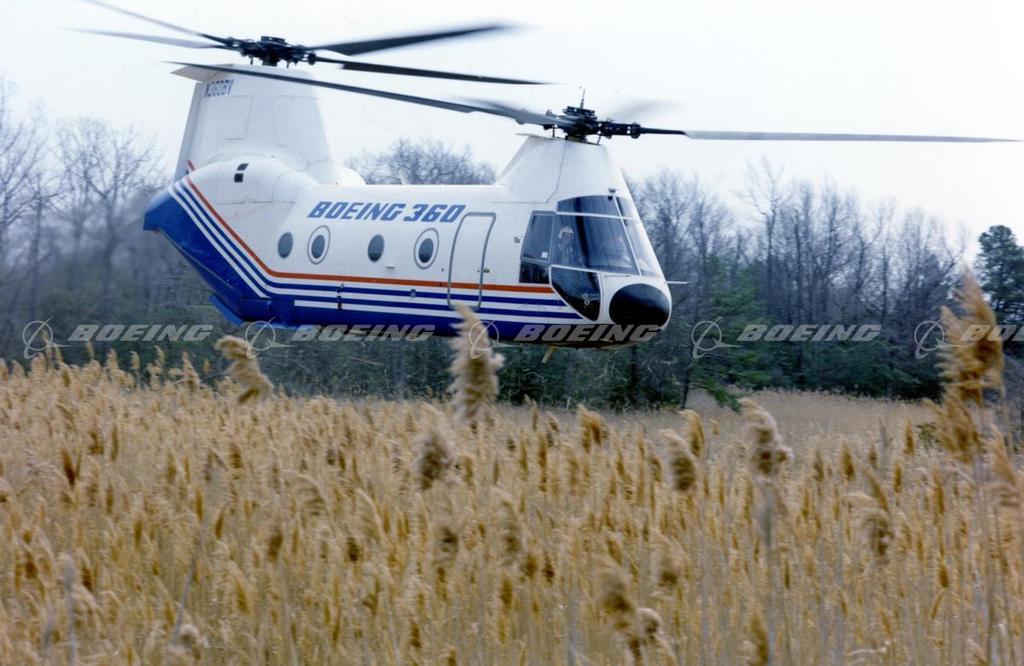 Boeing 360 tandem rotorcraft, N36OBV hovering nose right over open field. The Boeing Model 360 was an experimental helicopter developed by Boeing to demonstrate new technology, including extensive use of composite materials in the rotorheads and fuselage, a retracting landing gear and internal fuel cells. Design features were carried over to other programs, such as the RAH-66 Commanche and the V-22 Osprey.