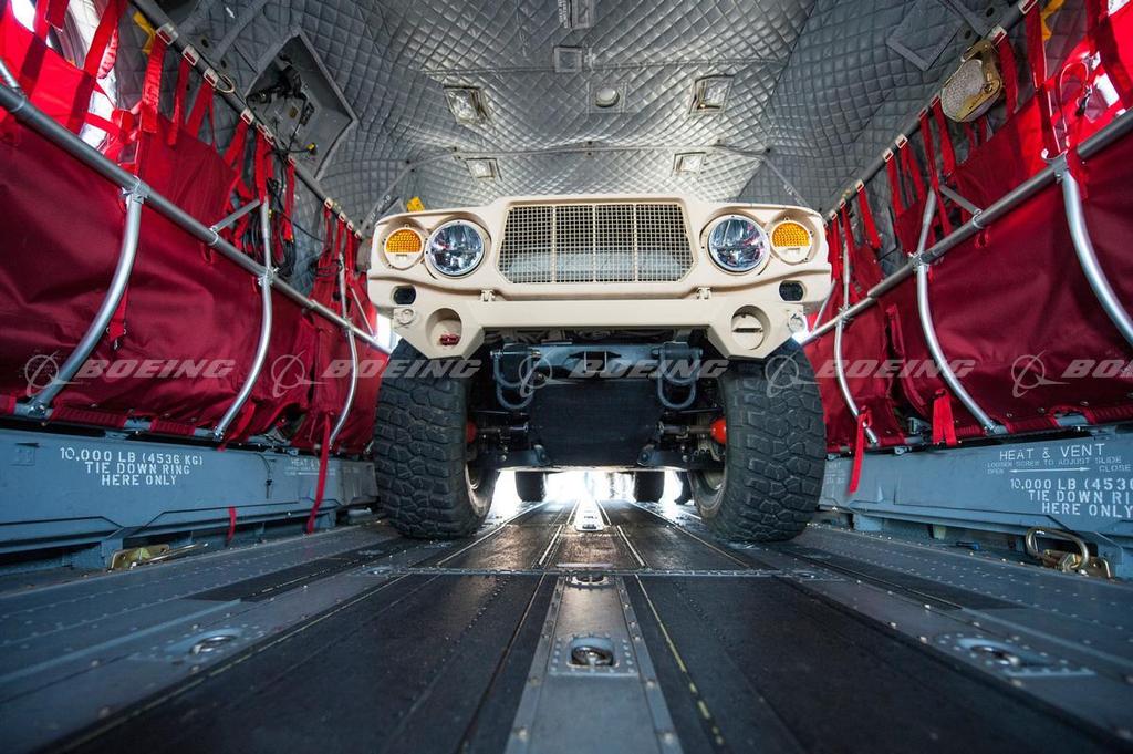 A Boeing Phantom Badger drives aboard a CH-47 Chinook in April 2014. Phantom Badger is a rugged combat support vehicle that features a modular design to provided added mission flexibility for the warfighter. It was certified for internal transport aboard the V-22 and CH-47 in 2014. Two Phantom Badgers can fit inside a CH-47.