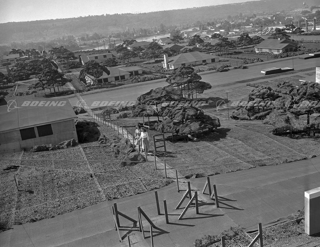During WWII, a 26-acre make-believe village was constructed on top of Boeing's Plant II in Seattle to provide a wartime cover for the facility. Cottages were made of painted canvas, trees were constructed of wire mesh and wood covered with chicken feathers, and the lawn was actually green burlap. Construction of the Wonderland facility atop Plant II required one million board feet of lumber and one and one half million square feet of chicken wire. There were 500,000 feet of support wires and 500 tons of steel structures to support higher elevations. The camouflage extended beyond Plant II to neighboring Boeing Field, albeit in a more sparsely decorated fashion. When the illusory scene was dismantled by Army engineers in 1946, it was necessary to remove 42,000 square yards of dummy streets, 10,000 square yards of concrete dummy houses and walks, 85,000 yards of camouflage texturing from runways, paint from four buildings and blackout paint from one hangar.