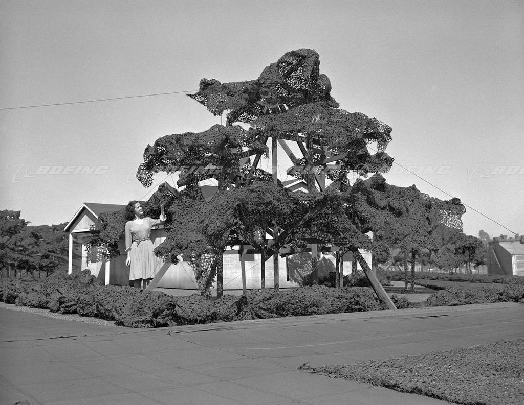 During WWII, a 26-acre make-believe village was constructed on top of Boeing's Plant II in Seattle to provide a wartime cover for the facility. Cottages were made of painted canvas, trees were constructed of wire mesh and wood covered with chicken feathers, and the lawn was actually green burlap. Construction of the Wonderland facility atop Plant II required one million board feet of lumber and one and one half million square feet of chicken wire. There were 500,000 feet of support wires and 500 tons of steel structures to support higher elevations. The camouflage extended beyond Plant II to neighboring Boeing Field, albeit in a more sparsely decorated fashion. When the illusory scene was dismantled by Army engineers in 1946, it was necessary to remove 42,000 square yards of dummy streets, 10,000 square yards of concrete dummy houses and walks, 85,000 yards of camouflage texturing from runways, paint from four buildings and blackout paint from one hangar.