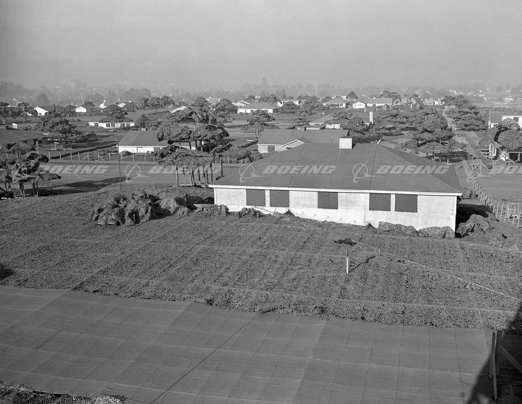Camouflage installations and materials on Boeing Field and Plant II during WWII included bomb shelters, machine gun platforms, troop dormitories, a casualty station and a message center. The most elaborate camouflage construction was the 26-acre illusory residential Wonderland atop the Plant II factory building shown here. Made of chicken-feather trees, painted canvas buildings, green burlap lawns landscaped with shrubs of spun glass on wire, the "village" had 53 residences, 24 garages, a corner service station, a neighborhood store and three green houses. The wartime cover for the plant extended over neighboring Boeing Field. The camouflage over Boeing Field sported the look of a more sparsely settled community. In 1946 the camouflage structures were dismantled by Army engineers.