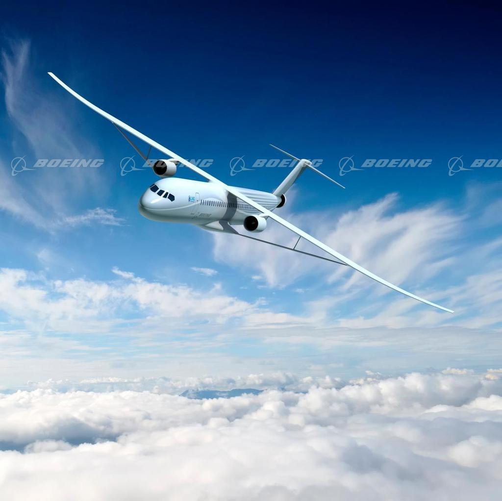 The revolutionary high wing, strut brace Boeing SUGAR Freeze is projected to be 64% more efficient than current 737-800 passenger aircraft. Cryogenically stored liquefied natural gas (hence "Freeze") is burned in a pair of unducted fan engines while also powering a solid-oxide fuel cell as an aft-thruster. LNG is projected to remain abundant in the 2045 time frame and is more environmentally friendly, making it an ideal substitute to current aviation fuel.