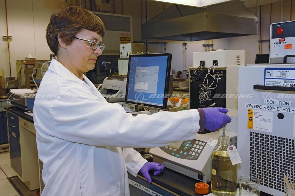 Boeing Lab Technician Julie Eberley conducts automated freeze point testing on jet fuel samples at the Boeing Commercial Airplanes Fuels and Lubricants Test Laboratory in Seattle, Wash. Boeing is exploring second-generation biofuel testing and processing methods to identify renewable alternative fuel sources for aviation uses as part of the company's environmental initiative.