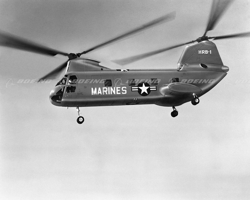 For release Monday, April 24, 1961. This is a photo of a pre-production Boeing Vertol 107 helicopter, retouched to show the aircraft in the markings of the U.S. Marine Corps' HRB-1. The HRB-1, a military version of the Boeing Vertol 107, was recently declared winner of a U.S. Navy competition for a Marine Corps assault transport helicopter, and features of the new helicopter were revealed today. It will have a powered blade-folding system to enable the helicopter's rotor blades to be folded by the pilot from the cockpit in a fraction of the time previously required by several men to fold helicopter blades manually. The powered blade-folding will simplify storage of the aircraft aboard aircraft carriers. Also included in the HRB-1 is a new integrated loading system which will permit loading to be completed in as little as eight minutes, even under demanding field conditions.