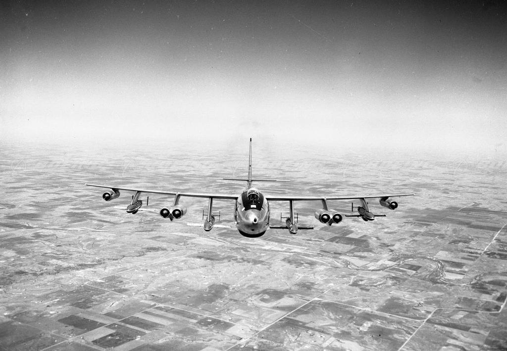 At the time of its first flight, Dec. 17, 1947, the B-47 Stratojet represented a radical departure from traditional design, and it set the design standards for all large jet aircraft until the present time. The six-engine Boeing B-47 was America's first multiengine swept-wing jet bomber. Its thin 116-foot wing was extraordinarily flexible and swept back at a 35-degree angle. Eighteen small rocket units in the fuselage provided jet-assisted takeoff (JATO), and parachutes cut its landing speeds. Later models were powered by 5,200-pound-thrust axial-flow jet engines, and top speeds were 600 mph.