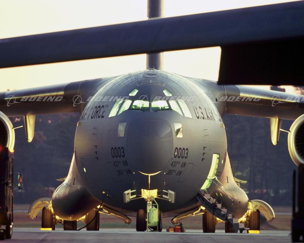 A high-wing, 4-engine, T-tailed military-transport aircraft, the multi-service C-17 can carry large equipment, supplies and troops directly to small airfields in harsh terrain anywhere in the world day or night. The massive, sturdy, long-haul aircraft tackles distance, destination and heavy, oversized payloads in unpredictable conditions. It has delivered cargo in every worldwide operation since the 1990s.
