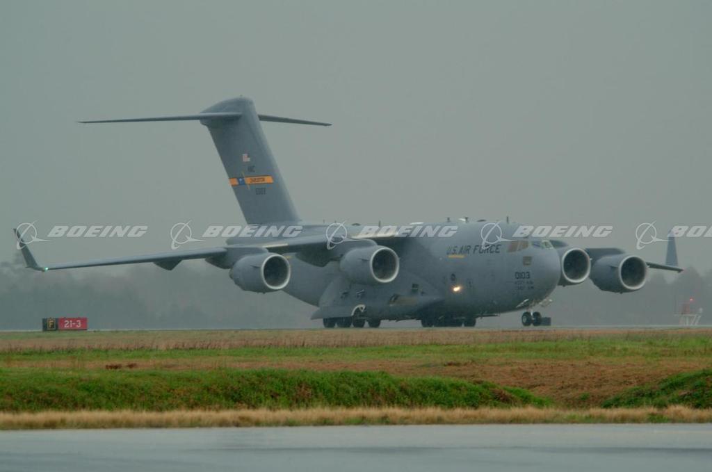 The C-17 Globemaster III is a high-wing, four-engine, T-tailed aircraft with a rear loading ramp. With its 160,000-pound payload, the C-17 can take off from a 7,600-foot airfield, fly 2,400 nautical miles and land on a small, austere airfield in 3,000 feet or less. On the ground, a fully loaded aircraft, using engine reversers, can back up a 2 percent slope. During normal testing, C-17s set 22 world records, including payload to altitude time-to-climb and the short takeoff and landing mark, in which the C-17 took off in less than 1,400 feet, carried a payload of 44,000 pounds to altitude and landed in less than 1,400 feet. Deployed in June 1993, it won the Collier Trophy in 1994, symbolizing the top aeronautical achievement of 1994.