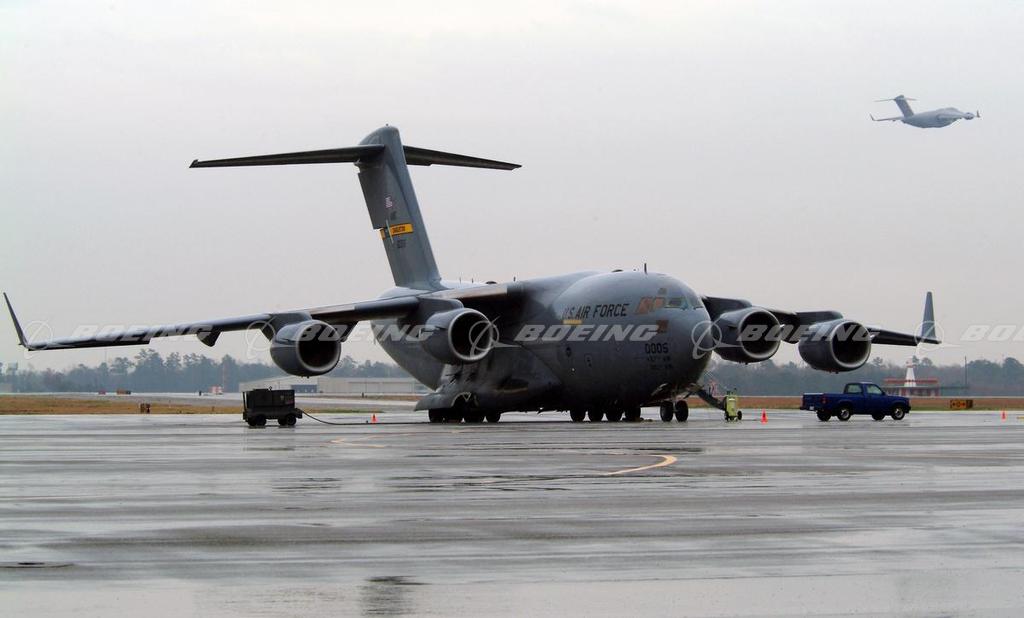 The C-17 Globemaster III is a high-wing, four-engine, T-tailed aircraft with a rear loading ramp. With its 160,000-pound payload, the C-17 can take off from a 7,600-foot airfield, fly 2,400 nautical miles and land on a small, austere airfield in 3,000 feet or less. On the ground, a fully loaded aircraft, using engine reversers, can back up a 2 percent slope. During normal testing, C-17s set 22 world records, including payload to altitude time-to-climb and the short takeoff and landing mark, in which the C-17 took off in less than 1,400 feet, carried a payload of 44,000 pounds to altitude and landed in less than 1,400 feet. Deployed in June 1993, it won the Collier Trophy in 1994, symbolizing the top aeronautical achievement of 1994.