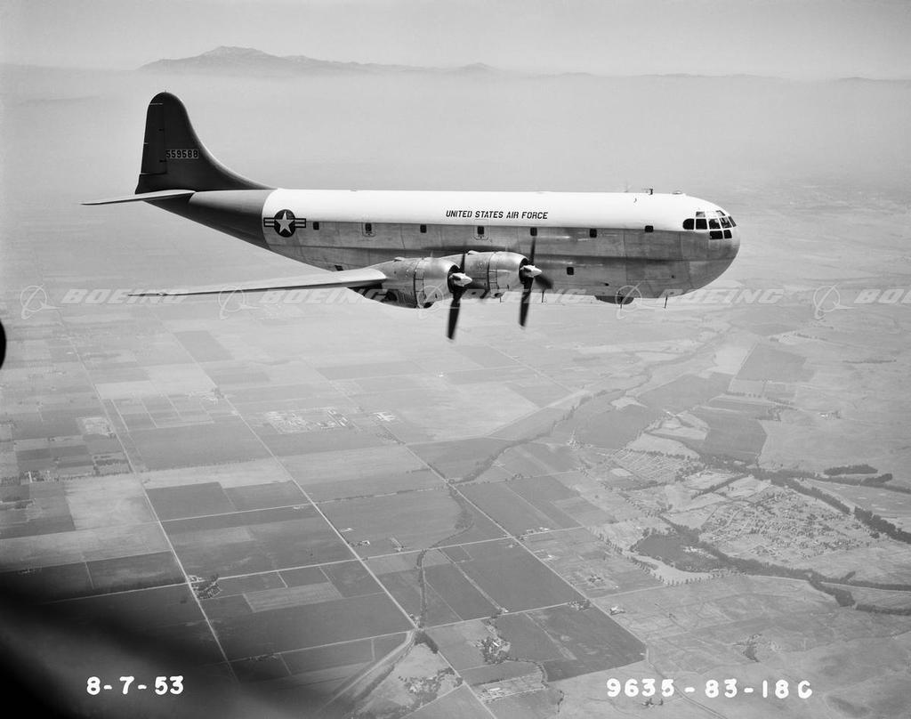 After the war Boeing developed the Model 367, a military transport based on the B-29 bomber. Its civilian counterpart was the Model 377 Stratocruiser. Cargo was loaded through large clamshell-type doors in the belly of the aircraft using a built-in ramp and a hoist. Its wings, engine gear and other parts were similar to the B-29.