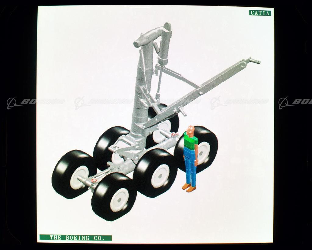 The main landing gear for the 777 is in a standard two-post arrangement but features six-wheel trucks, instead of the conventional four-wheel units. This provides the main landing gear with a total of 12 wheels for better weight distribution on runways and taxi areas, and avoids the need for a supplemental two-wheel gear under the center of the fuselage. The 777’s landing gear is the largest ever incorporated into a commercial airplane.