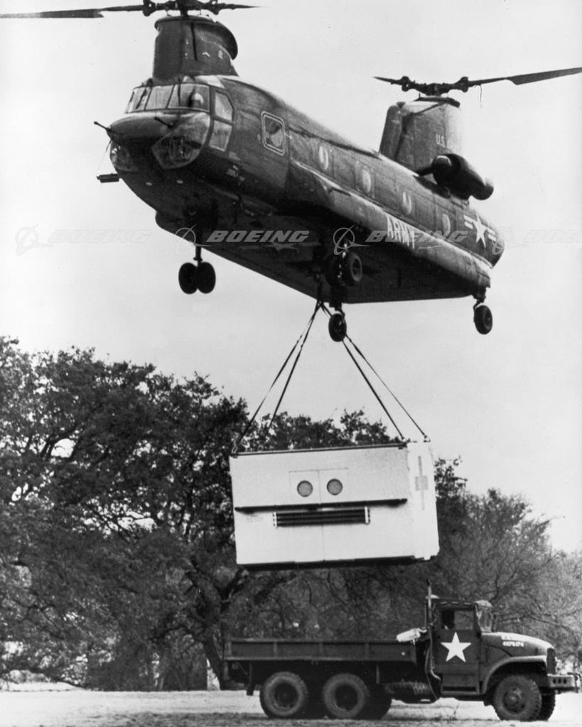 A U.S. Army's CH-47A Chinook helicopter transports the utility element of the Army's Medical Unit, Self-Contained, Transportable (MUST) field hospital in 1965. Weights of units range from 4,000 to 6,000 pounds. The Chinook was the only aircraft in the Army inventory capable of transporting this unit for a 100 mile mission at the time.