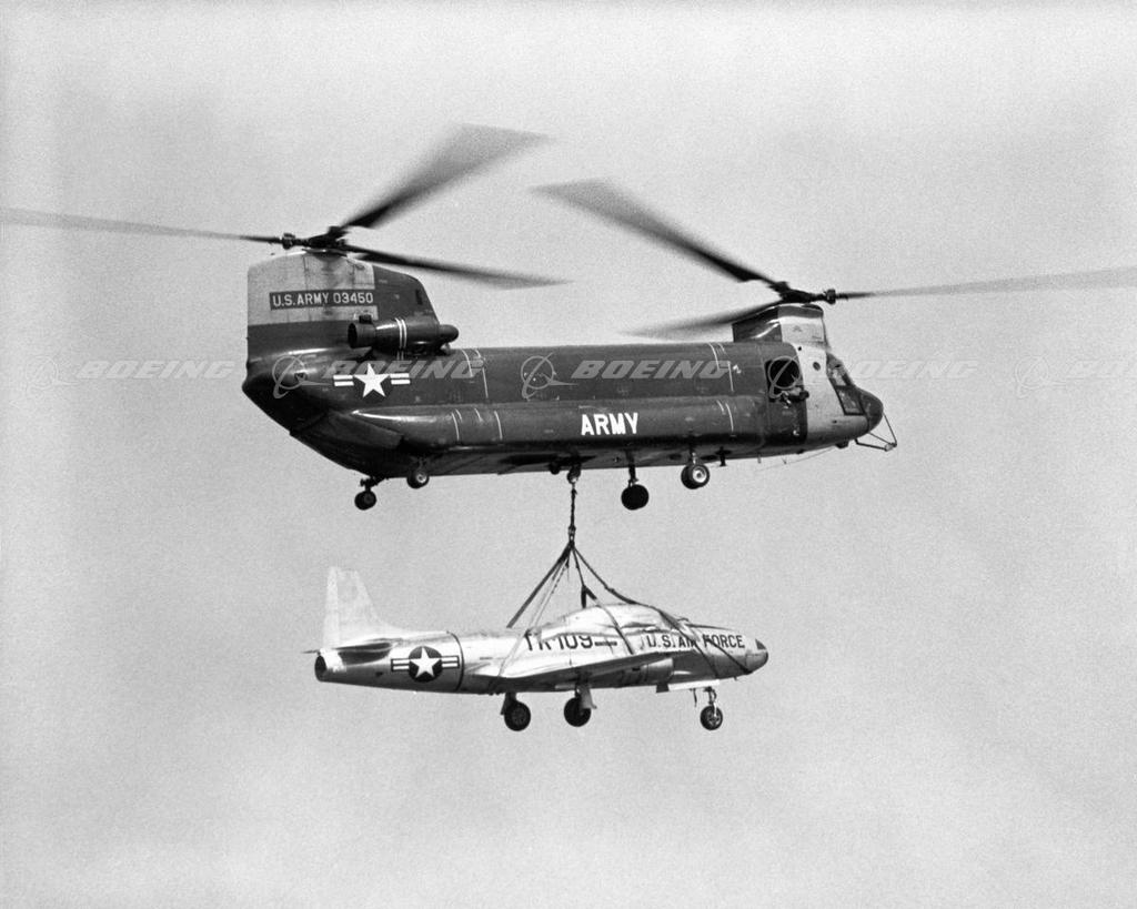 CH-47A Chinook Helicopter Transports Damaged Huey