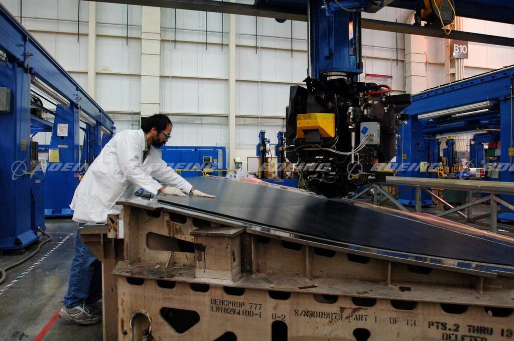 A Manufacturing Technician inspects a carbon fiber composite panel for a 777 vertical fin on an automatic tape lay-up machine at the Boeing composites manufacturing facility in Frederickson, Washington.