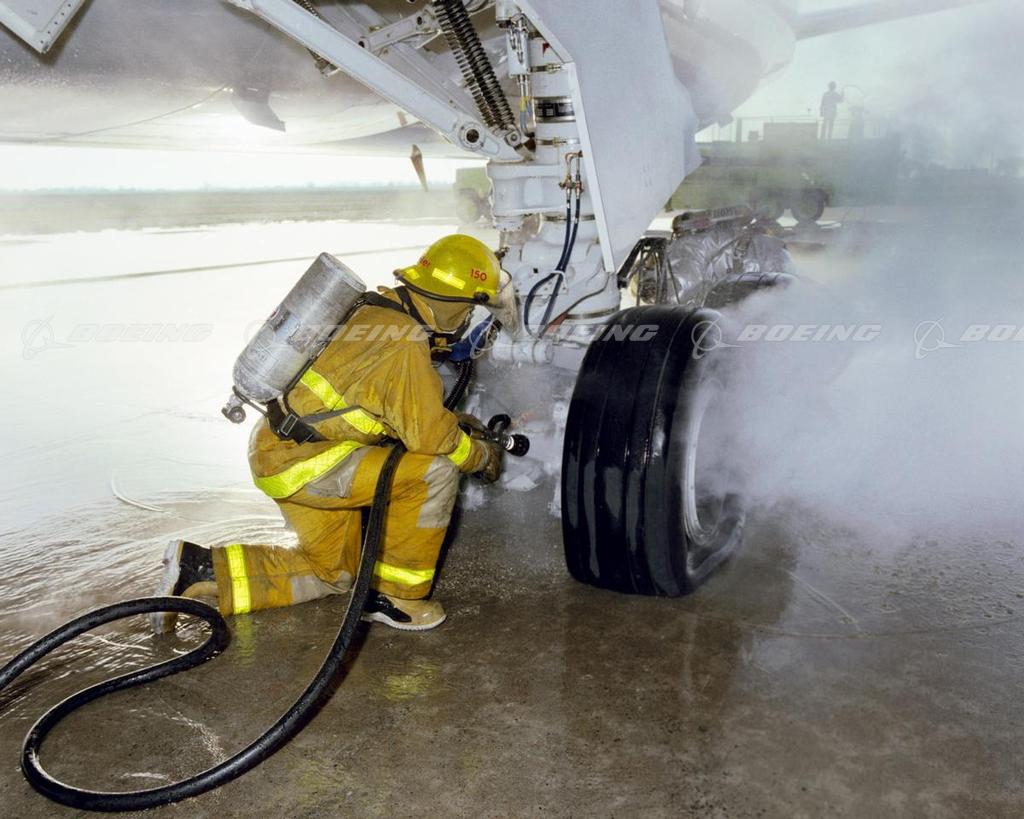 A firefighter helps cool down the brakes after an 85 percent rejected take-off test of new carbon brakes designed for the 767-200 and -300 airplanes by French supplier Messier-Bugatti. Shortly after the stop, the wheel fuse plugs melted to safely release tire pressure. Boeing will submit the test results to the Federal Aviation Administration in June 1999, with certification of the new brakes expected in mid-July. The brakes will be available for retrofit of existing airplanes and installation on new-production airplanes as early as third quarter 1999.