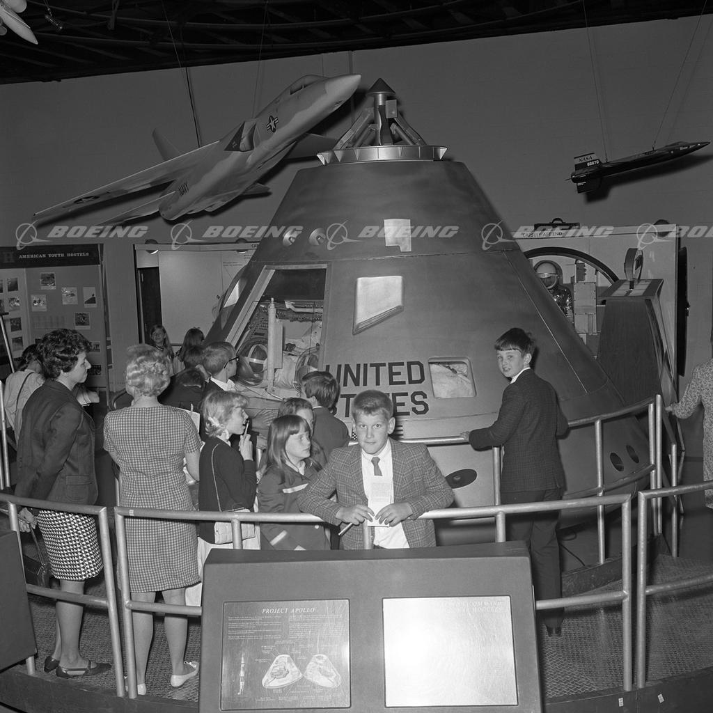 The Apollo program took the first humans to a landing on the Moon on July 20, 1969. The 12-foot Apollo command module was built at North American Rockwell’s plant at Downey, Calif. North American also built a 150-foot-high impact test facility, It looked like a gigantic playground swing and was used to check the module’s structural integrity and impact loads by drop-testing it on water, sand, gravel and boulders.
