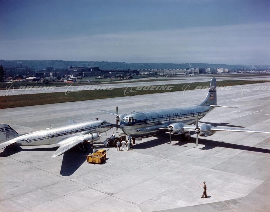 Boeing Model 377 and DC-3 on Boeing Field runway