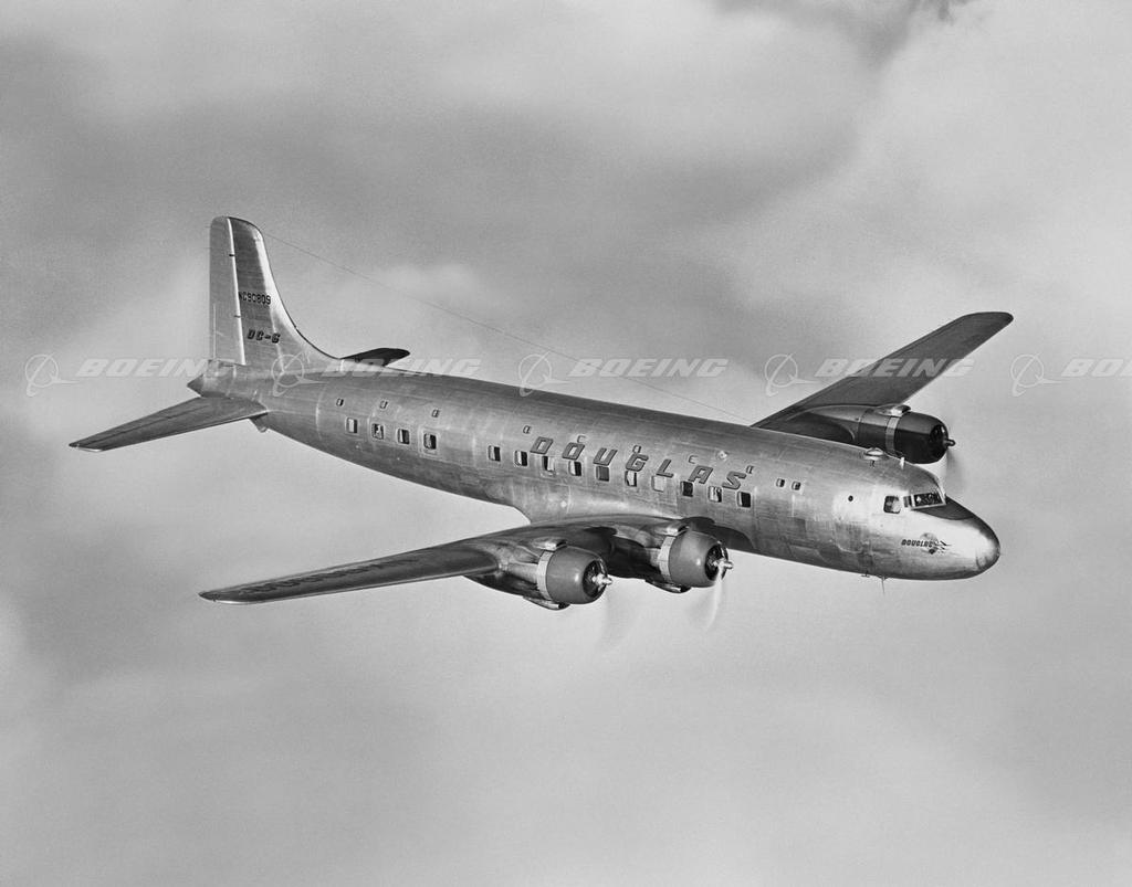 Douglas DC-6 (1946-1958): Nearly identical to the DC-4 in appearance, the DC-6 was first conceived as a long-range military transport. The plane made its maiden flight on February 15, 1946. The key difference between the DC-4 and DC-6 was the DC-6’s larger engines, which were twice as powerful as the engines on the DC-4. The DC-6 was the first Douglas airliner with a pressurized cabin, which enabled it to fly higher and faster, thus taking its passengers “over the weather.” The DC-6 was the most economical commercial aircraft of the propeller era. Its operating costs were among the lowest until jetliners came on the scene. Military versions were produced under the designations C-118 (Air Force) and R6D (Navy). President Harry Truman chose a DC-6 for official use, and christened it the “Independence,” for his hometown in Missouri. During its 12-year production run, Douglas delivered 537 DC-6s, plus 167 military versions.