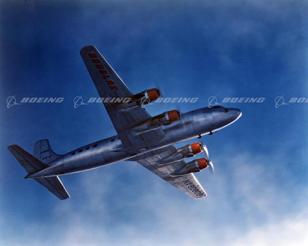 The Douglas DC-6 was one of the first airplanes to fly a regularly scheduled around-the-world route. With its higher performance, increased accommodation, greater payload and pressurized cabin, it was a natural evolution of the DC-4. Although the DC-6 had the same wingspan as the DC-4, its engines helped it fly 90 mph faster than the DC-4, carry 3,000 pounds more payload and fly 850 miles farther.