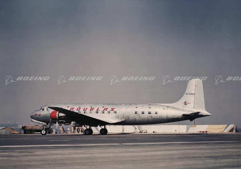 Douglas DC-6 (1946-1958): Nearly identical to the DC-4 in appearance, the DC-6 was first conceived as a long-range military transport. The plane made its maiden flight on February 15, 1946. The key difference between the DC-4 and DC-6 was the DC-6’s larger engines, which were twice as powerful as the engines on the DC-4. The DC-6 was the first Douglas airliner with a pressurized cabin, which enabled it to fly higher and faster, thus taking its passengers “over the weather.” The DC-6 was the most economical commercial aircraft of the propeller era. Its operating costs were among the lowest until jetliners came on the scene. Military versions were produced under the designations C-118 (Air Force) and R6D (Navy). President Harry Truman chose a DC-6 for official use, and christened it the “Independence,” for his hometown in Missouri. During its 12-year production run, Douglas delivered 537 DC-6s, plus 167 military versions.