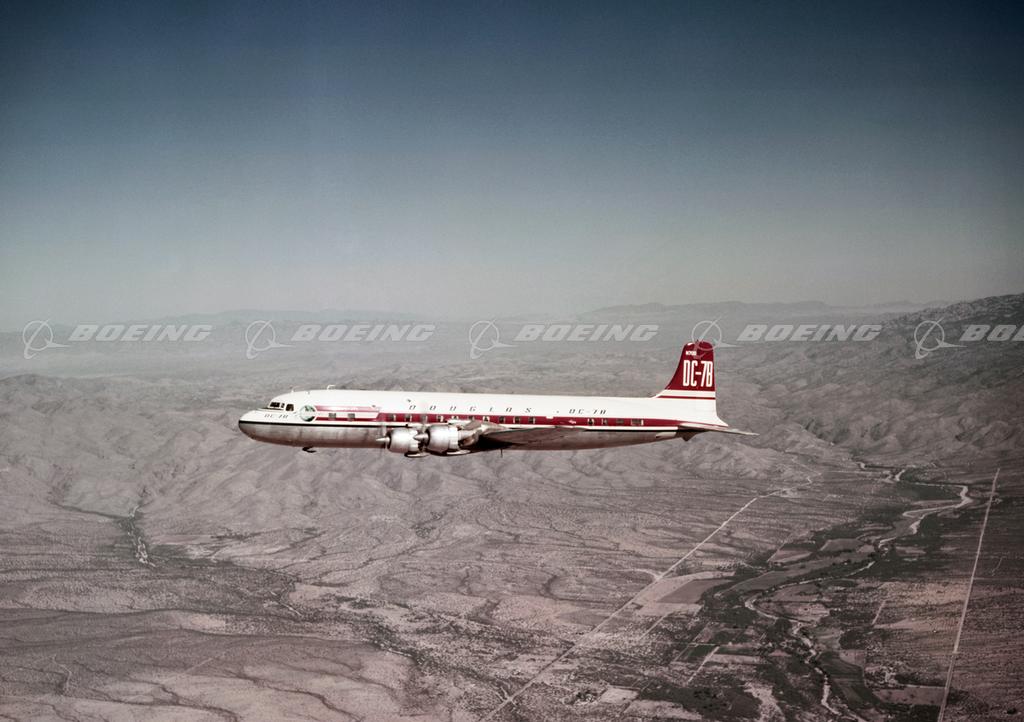 Douglas DC-7 (1953-1958): On May 18, 1953, Douglas introduced the DC-7, a larger and faster airliner than its DC-4 and DC-6 look-a-like predecessors. The DC-7 was powered by four “turbo-compound” engines, which enabled it to fly nonstop across the United States westbound against prevailing winds - a capability which the airlines of the day had dreamed of for years. A later version, the DC-7C, provided an even greater range capability that enabled it to fly anywhere in the world, thus earning the nickname “Seven Seas.” A total of 338 DC-7s were produced from 1953 to 1958, all for commercial airline customers. TheDC-7 was the last propeller driven airliner built by Douglas and the last built at the Santa Monica plant in Southern California.