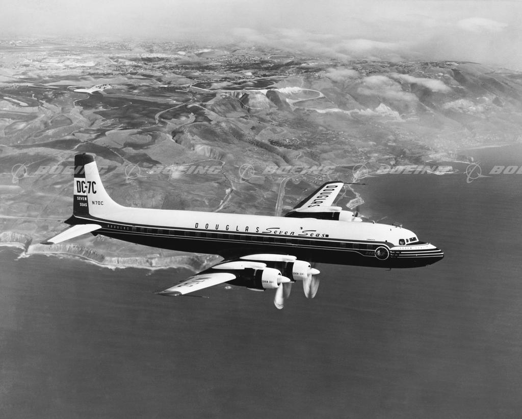 The DC-7 airplane was the last of the Douglas propeller-powered transports. Introduced in May 1953, it entered service with American Airlines in November 1953. It was the first commercial transport able to fly nonstop westbound across the United States against the prevailing winds. The DC-7C, or the Seven Seas, lived up to its name because it could fly 110 passengers anywhere in the world. Douglas built 338 DC-7 planes and delivered the last in 1958. Most DC-7 planes were modified as freighters or scrapped. Some were kept for air racing, aerial firefighting and satellite tracking.